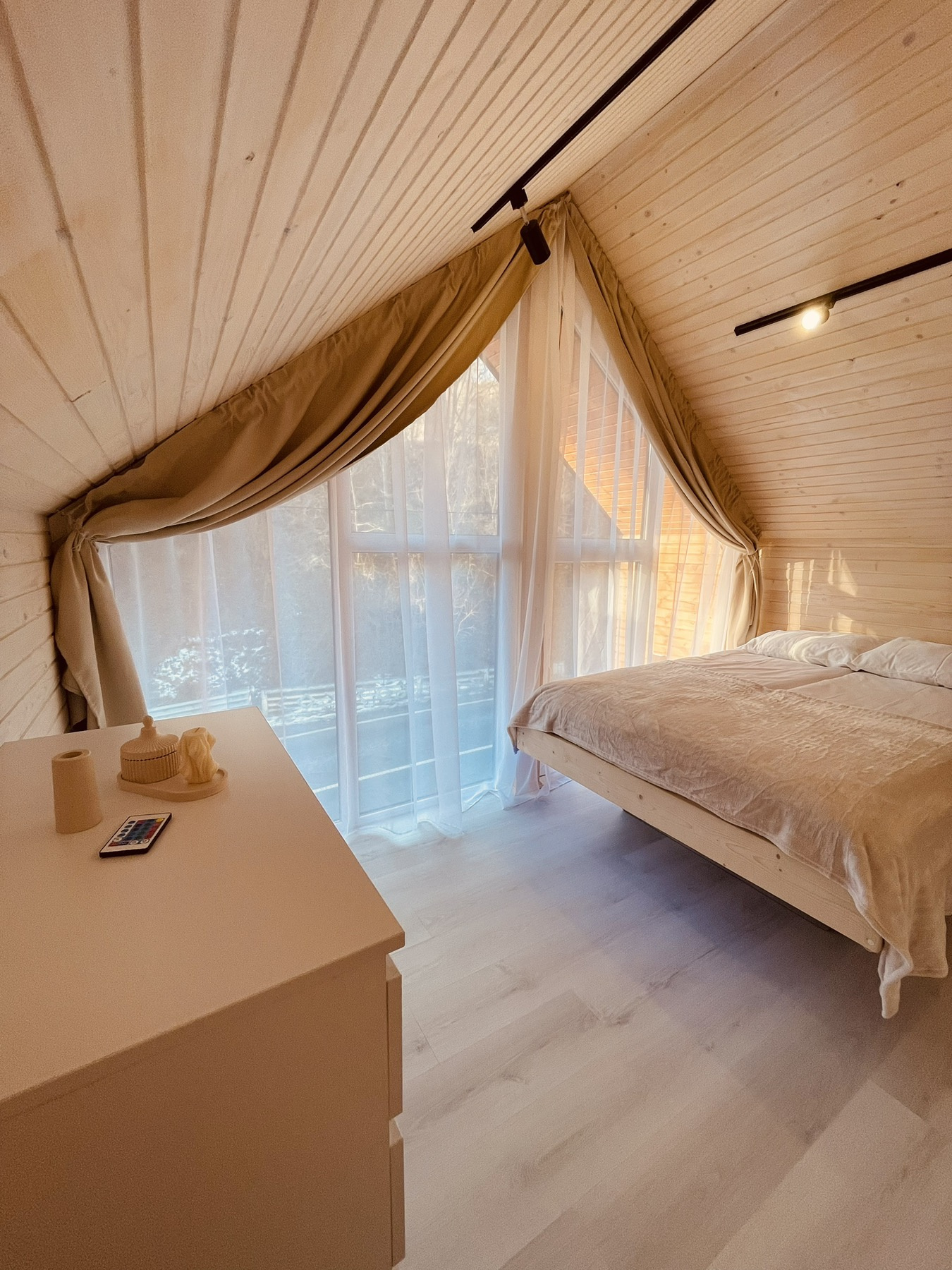 На першому поверсі кухня+вітальня, розкладний диван, телевізор, ванна кімната, вихід на балкон.