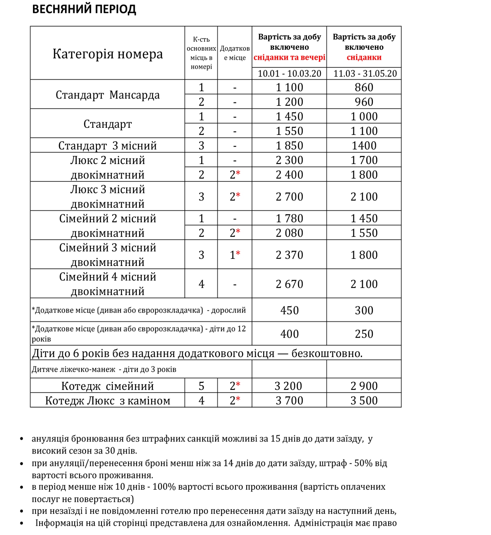 - Мансардний Сімейний складається з спальні (двоспальне ліжко або 2 односпальні ліжка, телевізор, крісло), вітальні (розкладний диван або двоспальне ліжко, шафа, телевізор) та санвузла (душ, туалет, умивальник).