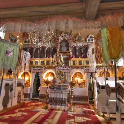 З низького, темного бабинця, через арку-виріз можна побачити розташований в головному приміщенні різьблений позолочений іконостас. Через те, що верхні частини бані нави занурені в морок і зеніт її майже не вловлюється, посилюється відчуття висоти цього приміщення, хоча в абсолютних розмірах воно вельми скромно. Живопис і різьблення іконостасу є досить своєрідні. Особливо запам'ятовуються царські врата, на полотнищах яких майстер розташував два симетричних стебла, у верхніх завитках якого в медальйонах він написав «Благовіщення», а в нижніх - чотирьох євангелістів.