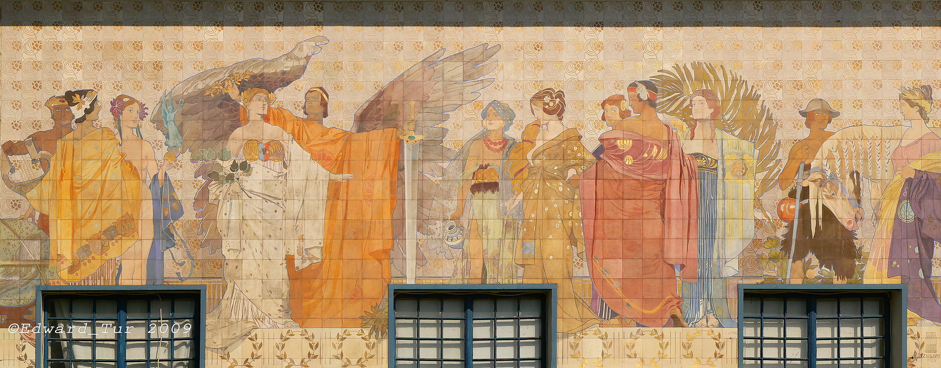 The main façade features a risalit with a balcony on consoles and a magnificent majolica panel above the balcony, created by the artist whose signature "J. Lan(g?)" is indicated in its lower part (Joseph Adolf Liang). The complex polychrome composition on mythological themes draws a parallel between the Roman Empire and Austria-Hungary under Franz Joseph I. The 12 gods represent the 12 most important provinces of the empire, which embodied its essence. On the panel, the gods are arranged in picturesque groups in accordance with the basic principle of Art Nouveau: dynamic balance instead of mirror symmetry.