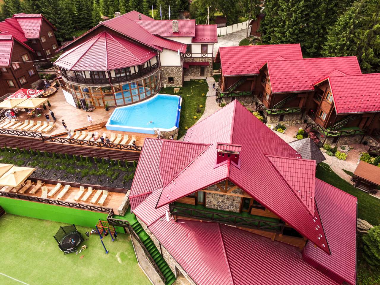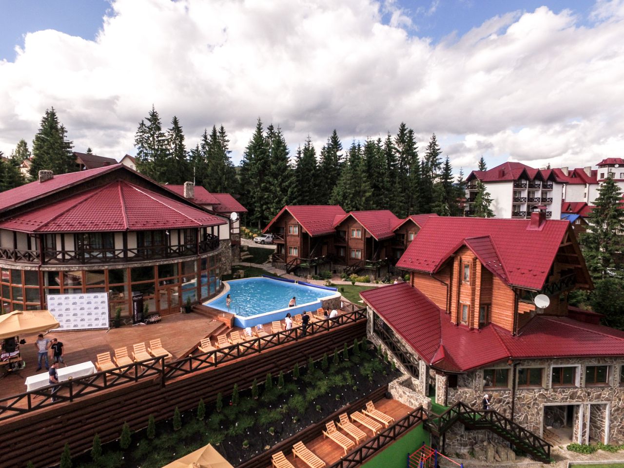 Комплекс складають: 2 п'ятиповерхові будівлі, 2 дерев'яні двоповерхові котеджі, шале. На першому поверсі центрального корпусу - рецепція з холом, ресторан на 40 місць, магазин (міні-маркет). Поселення - з 14:00; Виселення - до 10:00. Сніданок враховано у вартість проживання усіх номерів. Котедж-Шале ціна без сніданку. Сніданок - 130 грн.
