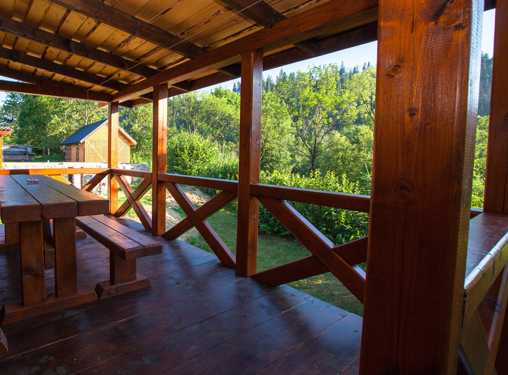 - На першому поверсі — гостинна-кухня (стіл з лавочками, розкладний диван, телевізор, кухонний блок, газова плита, холодильник, мікрохвильова піч, електрочайник, піч), санвузол (душова кабіна, туалет, умивальник), вихід на літню терасу.