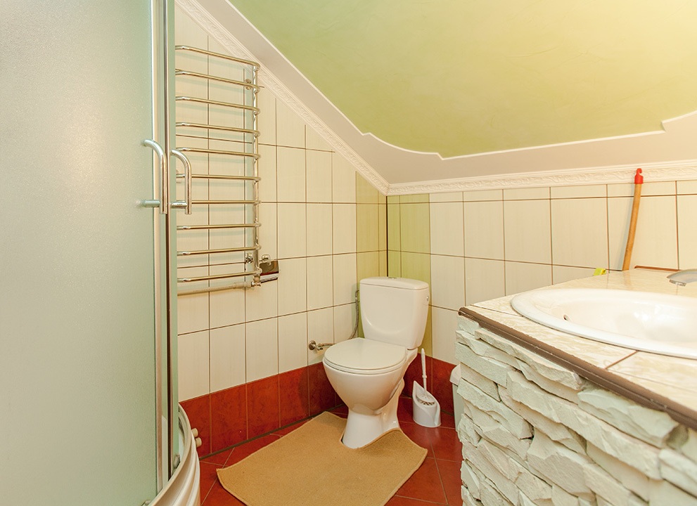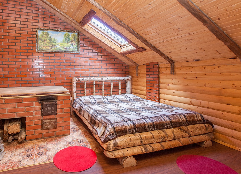 - На другому поверсі — двомісний номер (двоспальне ліжко, шафа для одягу, стіл зі стільцями, телевізор).
