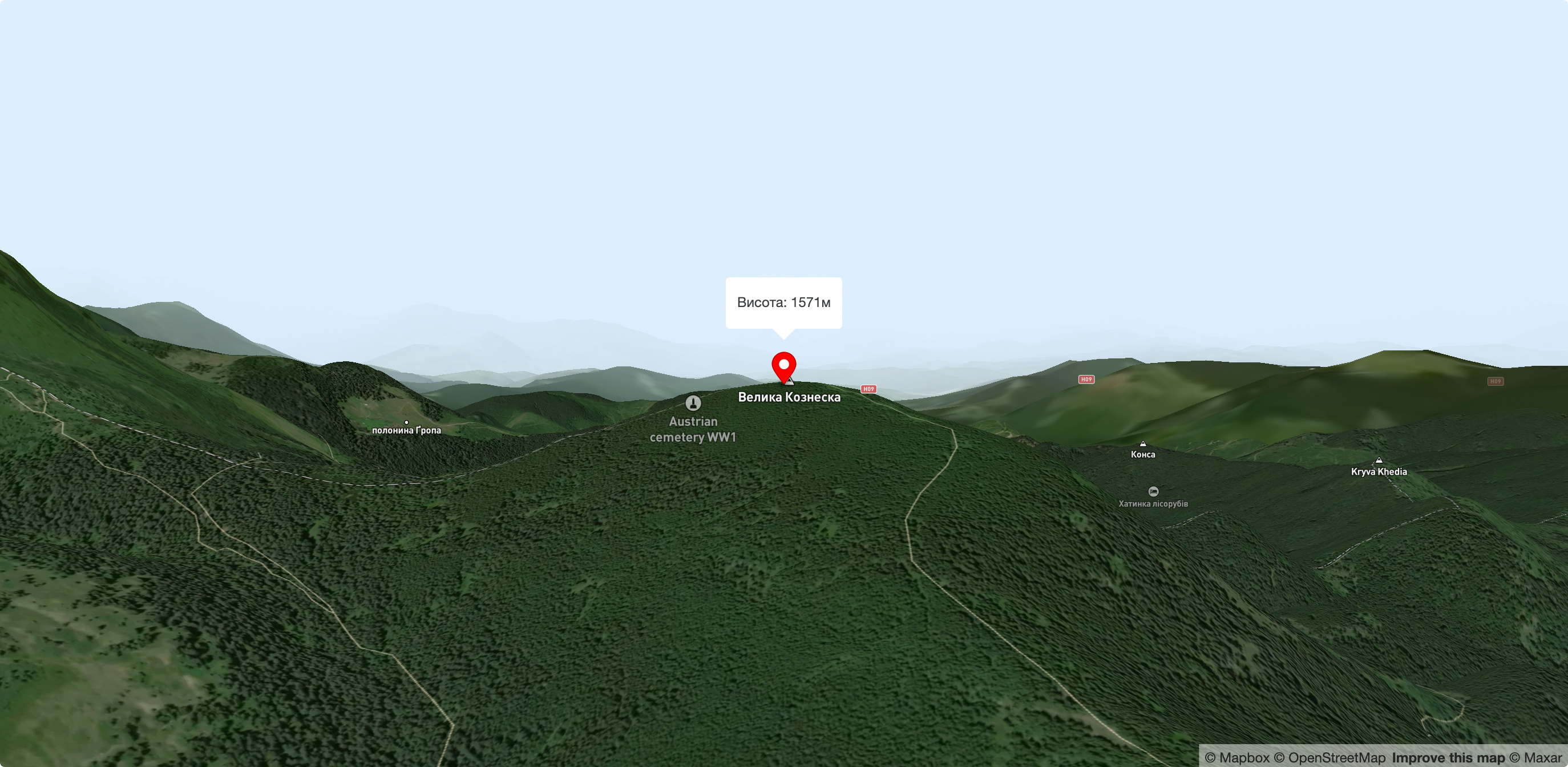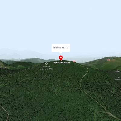 Гора Велика Козьмеска - вершина висотою 1571,7 м над р.м. Гора має форму піраміди із трьома пологими відрогами. Невеличка ділянка вершини вкрита травами, низькорослими ялинками, кущами ялівця й чорниці. Пік гори позначено бетонним стовпчиком №4. Тут є багато місця для кемпінгу. Крізь дерева видно гору Говерлу.