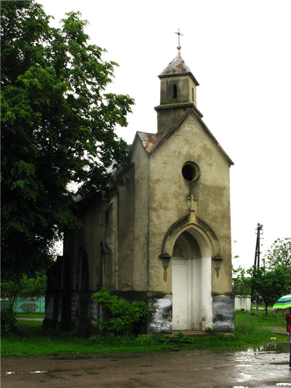 Католицька каплиця збереглася у формах неоготики з домішками місцевих традиції зодчества. Інтер'єри не збереглися. На сьогодні не функціонує і перебуває у запущеному стані із забитими дверима прямо у центрі села. На фронтоні костелу вимуруваний родовий герб з двома левами, що тримають корону.