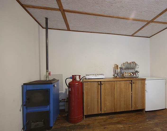 - На першому поверсі - кухня (газова плита, холодильник, мийка, пральна машина, стіл), двомісна кімната (двоспальне ліжко, комод, вішалка для одягу, телевізор), санвузол (ванна, туалет, умивальник).