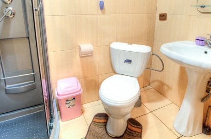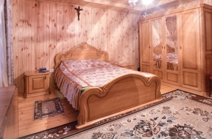 - 1 поверх - напівлюкс (двоспальне ліжко, шафа, трюмо, тумбочки, столик, крісла, телевізор, санвузол (душ, туалет, умивальник));