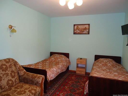• До ваших послуг інший одноповерховий котедж на 7 місць в садибі "Шум Черемоша" на 6-8 чоловік з кухнею (електроплита, холодильник, електрочайник, мийка, посуд), санвузол (ванна, туалет, умивальник),  двомісна кімната (2 односпальні ліжка, шафа для одягу); 2 тримісні кімнати (двоспальне або 2 односпальні ліжка, розкладний диван, телевізор, шафа для одягу). В садибі функціонує сауна на дровах, при бажання гостей можна провести дегустацію чаю з цілющих карпатських трав. Котедж здається повністю.