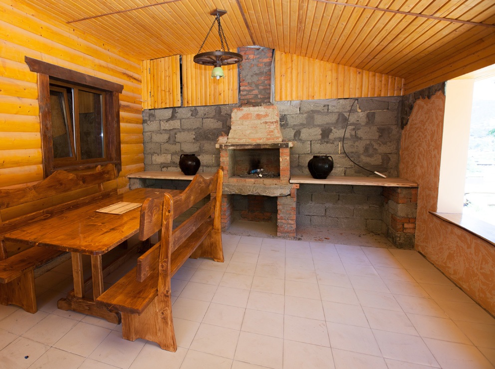 - На першому поверсі знаходиться кухня з електроплитою, холодильником, столом, м'яким кутком, посудом, електрочайником, обідній зал, двомісна кімната з двоспальним ліжком; санвузол з душем, туалетом та умивальником. З окремим входом є відпочинкова закрита тераса з мангалом, каміном, столом з лавками.