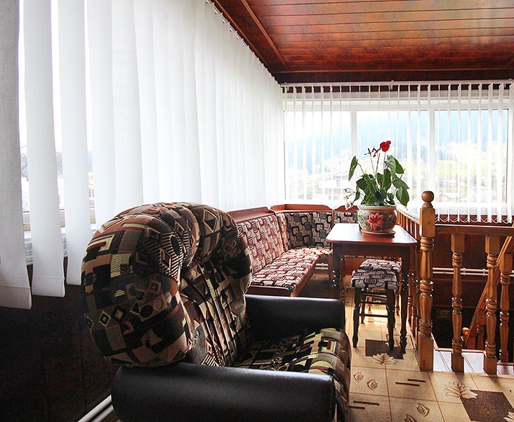 - На другому поверсі - двокімнатний номер (в одній кімнаті є розкладний диван, шафа для одягу; в іншій - двоспальне ліжко, шафа для одягу, телевізор), шестимісний номер (3 розкладні дивани, шафа для одягу), санвузол (туалет, умивальник). Опалення: автономне водяне. Водопостачання: холодна вода постійно, гаряча - бойлер на 180 л. Безперебійне електричне живлення.