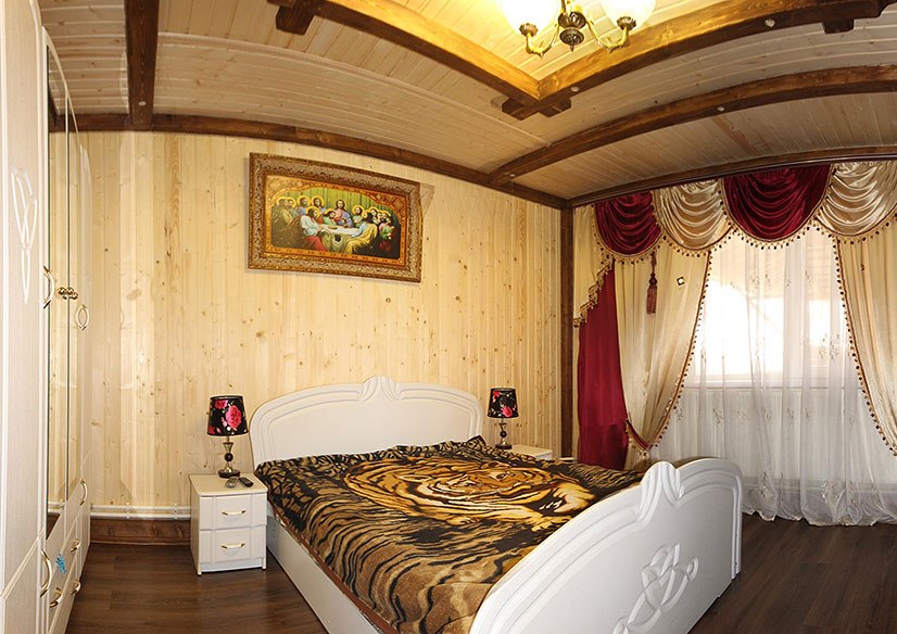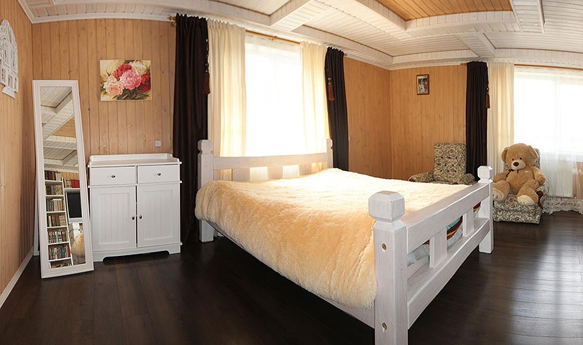 - На першому поверсі - кухня (мікрохвильова піч, холодильник, електрочайник, необхідний посуд, мийка, обідній стіл), вітальня з каміном (розкладний куток, телевізор, стіл зі стільцями), двомісний номер (двоспальне ліжко, шафа для одягу, телевізор), санвузол (ванна, біде, туалет, умивальник, пральна машина).