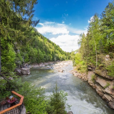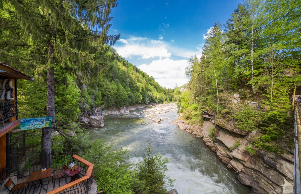 The main river that flows through the Yaremche region is the Prut. The river's sources begin on the northern slopes of Chornohora at an altitude of over 1750 meters above sea level. The main tributaries of the Prut are the Prutets Yablunytskyi, Zhonka Kamianka, Piga, Prutets Chemehivskyi, and Homulets. Every year, international and national rafting competitions and amateur kayaking trips are held on the Prut River.