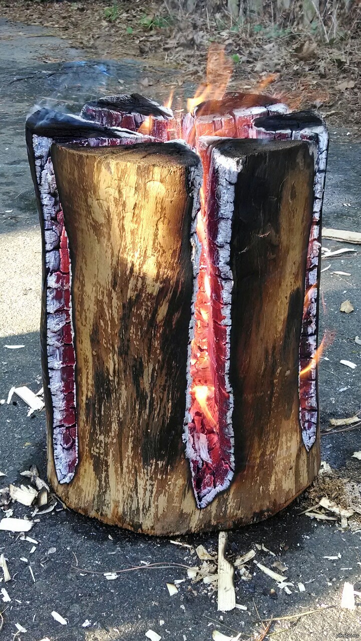 Для початку треба знайти або підготувати собі полінце висотою до 50 см і довільною шириною. Далі нам потрібно розрубати це поліно на 4 частини і в кожній сокирою вибрати серцевинку, щоб легко було розпалити свічку в середині. Коли з'єднати ці 4 частинки, то в середині буде отвір 5-8 см. Серцевинку не викидуємо, а використовуємо для розпалювання свічі.