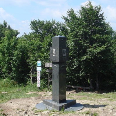 Запам’ятаєте це місце, оскільки сюди буде спуск по дорозі назад. Звідси до державного кордону вся траса промаркована двома білими і однією червоною смужками, нанесеними на дерева. У деяких місцях встановлені або нанесені додаткові стрілки, виконані червоною фарбою. Упродовж 5 кілометрів дорога повільно піднімається вгору, потім заходить в ліс і різко набирає висоту. Пройшовши трохи більше 1 км крутого підйому, виходимо на мальовничу полянку, на якій затишно розмістився великий дерев’яний будинок лісників (мисливців). Будинок має дві кімнати, обладнаний печами і нарами. Через 500 метрів від житла біля стежки, що лежить по курсу 238°, знаходиться джерело. Продовжимо наш шлях по стежці, що йде на північ курсом 25°. Через 930 м стежина повертає на схід (297°) і змійкою тягнеться між криволіссям і молодими деревами, міняючи кілька разів напрям то на північний, то на східний. Незабаром виходимо на розгалуження стежок, де встановлений показник у бік джерела. Проте, наш шлях лежить строго на північ. Метрів через сто виходимо на відкритий простір і впираємося в державний кордон України з Польщею. Повертаємо вліво на захід (247°) і рухаємося по стежці між прикордонними стовпами. Через 600 м після повороту виходимо на вершину г.Кремінець (1,216 м.н.р.м.), а через ще 150 м на місце (1,210 м.н.р.м.), де сходяться кордони трьох країн. Тут встановлена тригранна гранітна стела, на гранях якої вибиті герби України, Польщі та Словаччини відповідно. Звідси відкриваються огляди на хребет Явірник (напрям 185°) і гору Велька Равка (1,307 м.н.р.м.), азимут 45°.