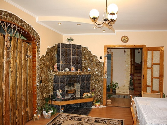- На першому поверсі - вітальня з каміном та обіднім столом, кухня (газова плита, мікрохвильова піч, холодильник, електрочайник, посуд), 2 спальні (двоспальне та односпальне ліжка, шафа для одягу, телевізор), санвузол (ванна, умивальник, туалет).