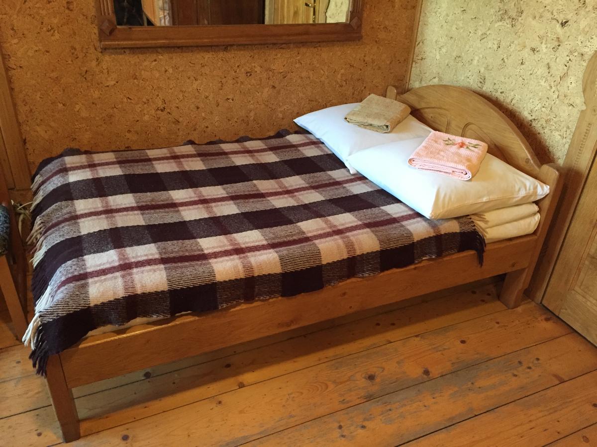 - Верхній номер для 3-х гостей з великим двоспальним ліжком і односпальним. Перелік вигод у "Верхньому" номері: ліжко двомісне (1950х1600 мм), ліжко одномісне (1950х900 мм), тумба для одягу та під телевізор, телевізор, стіл, крісла - 4 шт., веранда літня (6х4) м на 1му поверсі, стіл з 4-ма кріслами, бамбетня (ліжак гуцульський), душова кабіна, умивальник, унітаз, дзеркало.