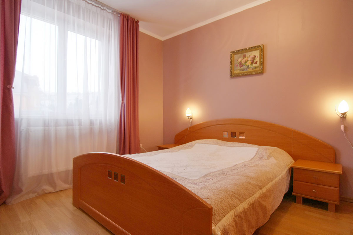 - Двокімнатний номер Люкс має двоспальне ліжко, шафа-купе, двоспальний розкладний диван, журнальний столик, холодильник, електрочайник, санвузол (туалет, умивальник, душ, біде).