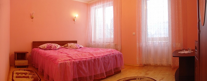 - Люкс (3 номери) - двокімнатний номер, вітальня (м'яка частина, шафа для одягу, комод, балкон, телевізор, холодильник), спальня (двоспальне ліжко, розкладне крісло, шафа для одягу, телевізор, балкон), санвузол (душова кабіна, туалет, умивальник).