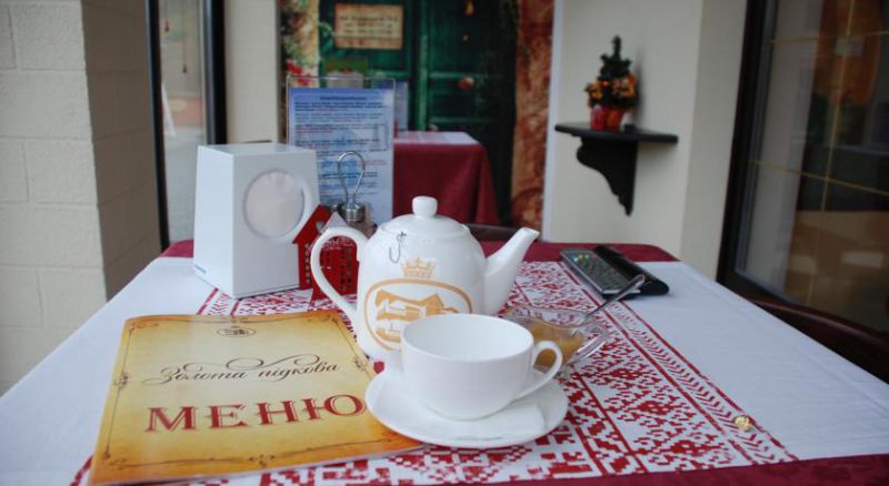 На території готелю працює ресторан, що спеціалізується на стравах української кухні. Щоранку для гостей готелю сервірують сніданок.