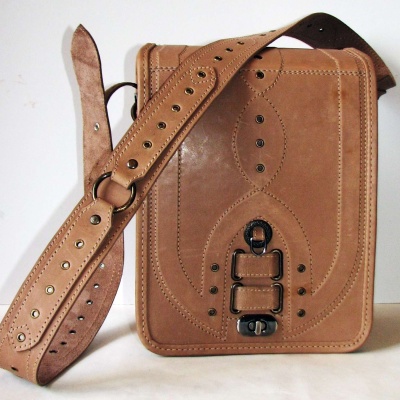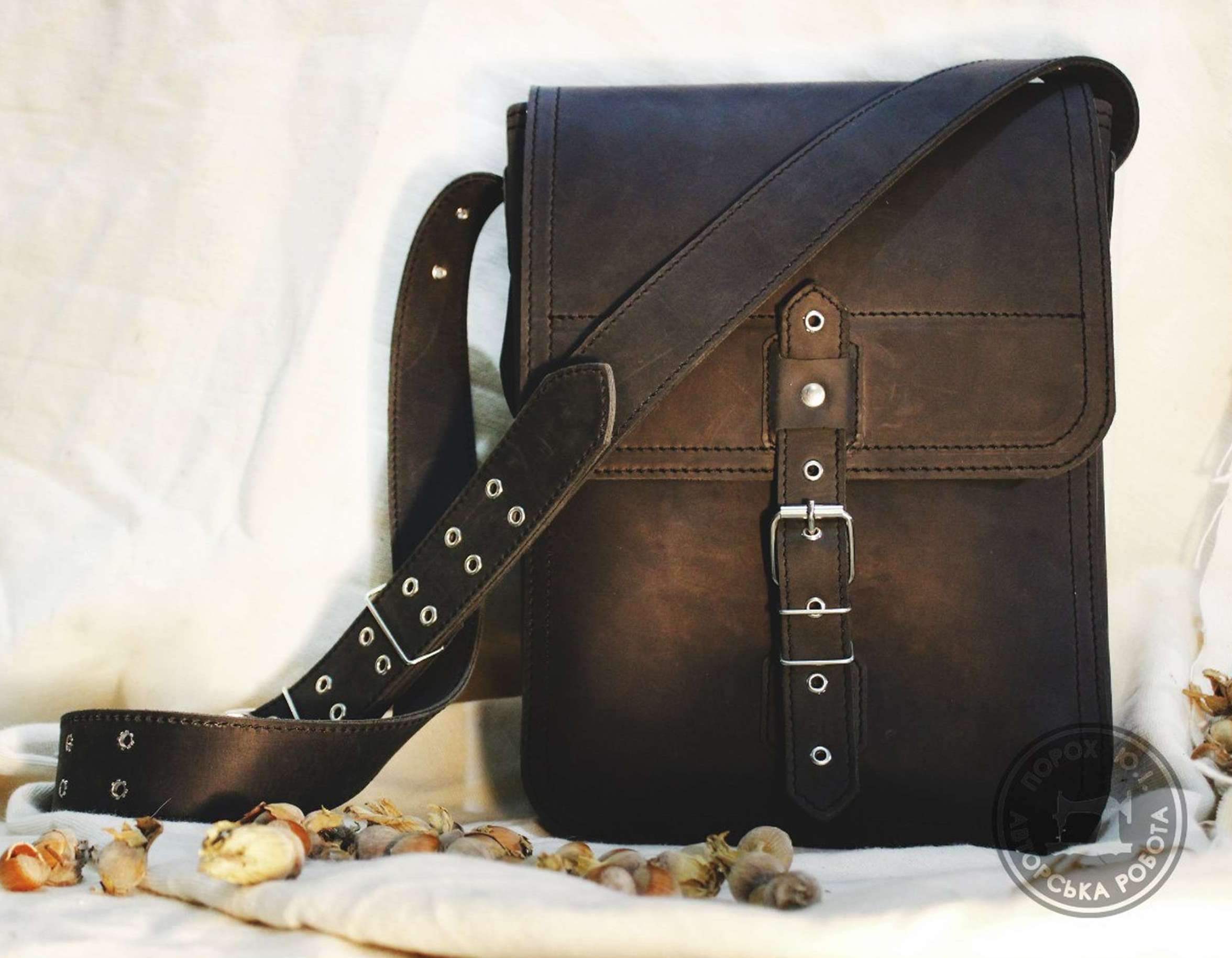 Також гарним подарунком буде шкіряна сумка через плече ручної роботи.