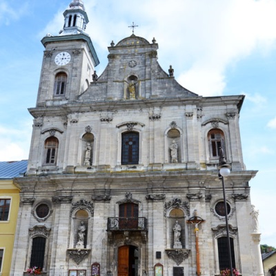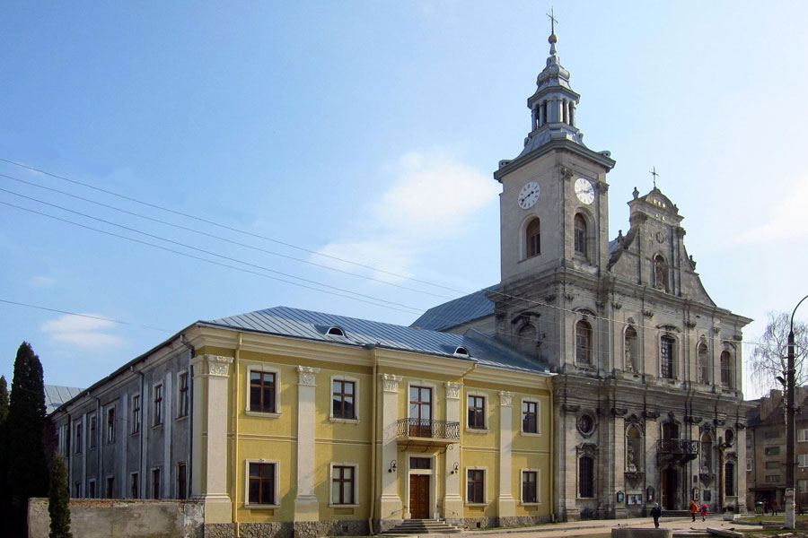 Бароковий храм збудовано з цегли і каменю. Він має три нави, центральна з яких вища за бічні та півциркульну апсиду. Триярусний головний фасад розчленований пілястрами та горизонтальними карнизами. На першому ярусі пілястри іонійського, на другому — коринфського ордерів. Напівциркульні заглибини оздоблені рослинними візерунками доби пізнього бароко. Центральний портал підкреслено невеличким балконом з кованою ґраткою. Фасад храму увінчаний лише однією вежою з лівого боку.