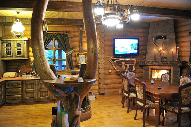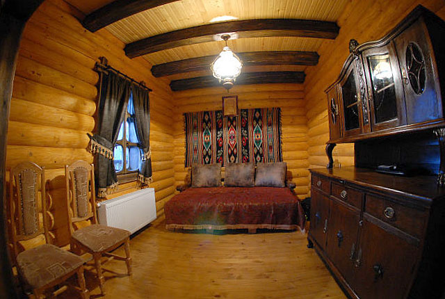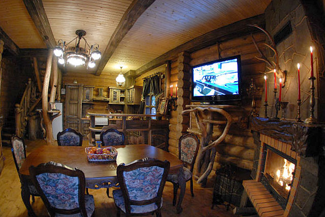 - На першому поверсі - вітальня з каміном (телевізор, обідній стіл зі стільцями; кухонний куток - газова плита, мийка, холодильник, електрочайник, мікрохвильова піч, необхідний посуд), двомісна кімната (розкладний диван, шафа для одягу, телевізор), санвузол (душова кабіна, туалет, умивальник).