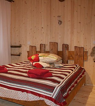 - На першому поверсі — хол (шафа для одягу, холодильник), зал для харчування (дерев'яний столик з лавами, телевізор, вихід на терасу), двомісний номер (двоспальне ліжко, шафа для одягу, телевізор, санвузол - душова кабіна, туалет, умивальник), тримісний номер (двоспальне ліжко, розкладний диван, шафа, телевізор, санвузол).