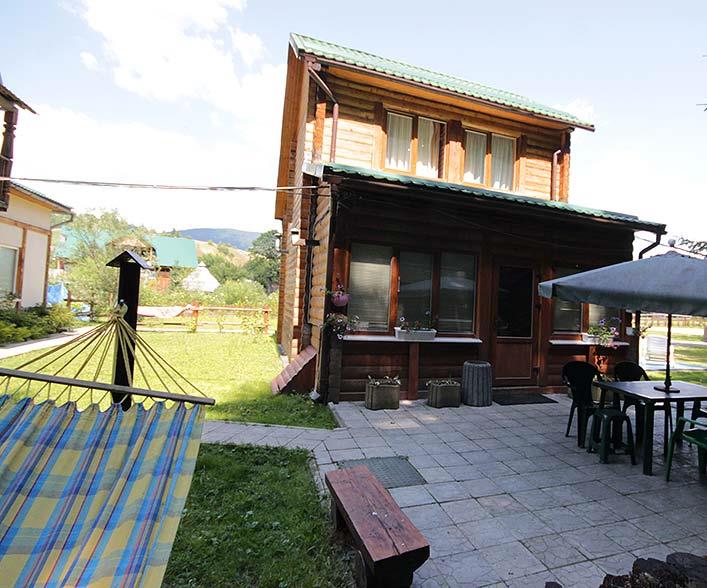 - Котедж з лазнею на 4-6 осіб. На першому поверсі - кухня (електрична плита, мікрохвильова піч, холодильник, електрочайник, мийка, посуд, пральна машина). На другому поверсі - вітальня з розкладним кутком і тенісним столом, 2 двомісні кімнати (у кожній є двоспальне ліжко, комод, телевізор), санвузол на першому поверсі (душ, туалет, умивальник). Можливі додаткові місця - розкладні ліжка.