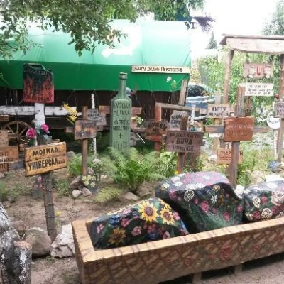 окремого слова варта ще одна прикольна фішка ресторану — це, безперечно, гумористичне кладовище. Зазвичай, на цвинтарі люди плачуть, але на цьому кладовищі люди сміються. Адже тут кожен могильний камінь — привід для сміху. На цьому цвинтарі поховані ідеали Майдану, чесні вибори в Мукачеві, Укренерго, що не змогли пережити зиму 2009, свій прихисток знайшов тут офіціант-шахрай із прибитим до хреста підносом, похований тут і представник правдивих ЗМІ, а також той, хто не закушував.