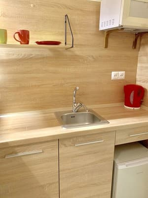 Кухня в квартирі обладнана холодильником, мікрохвильовою піччю і електро чайником, а також кухонним начинням.
