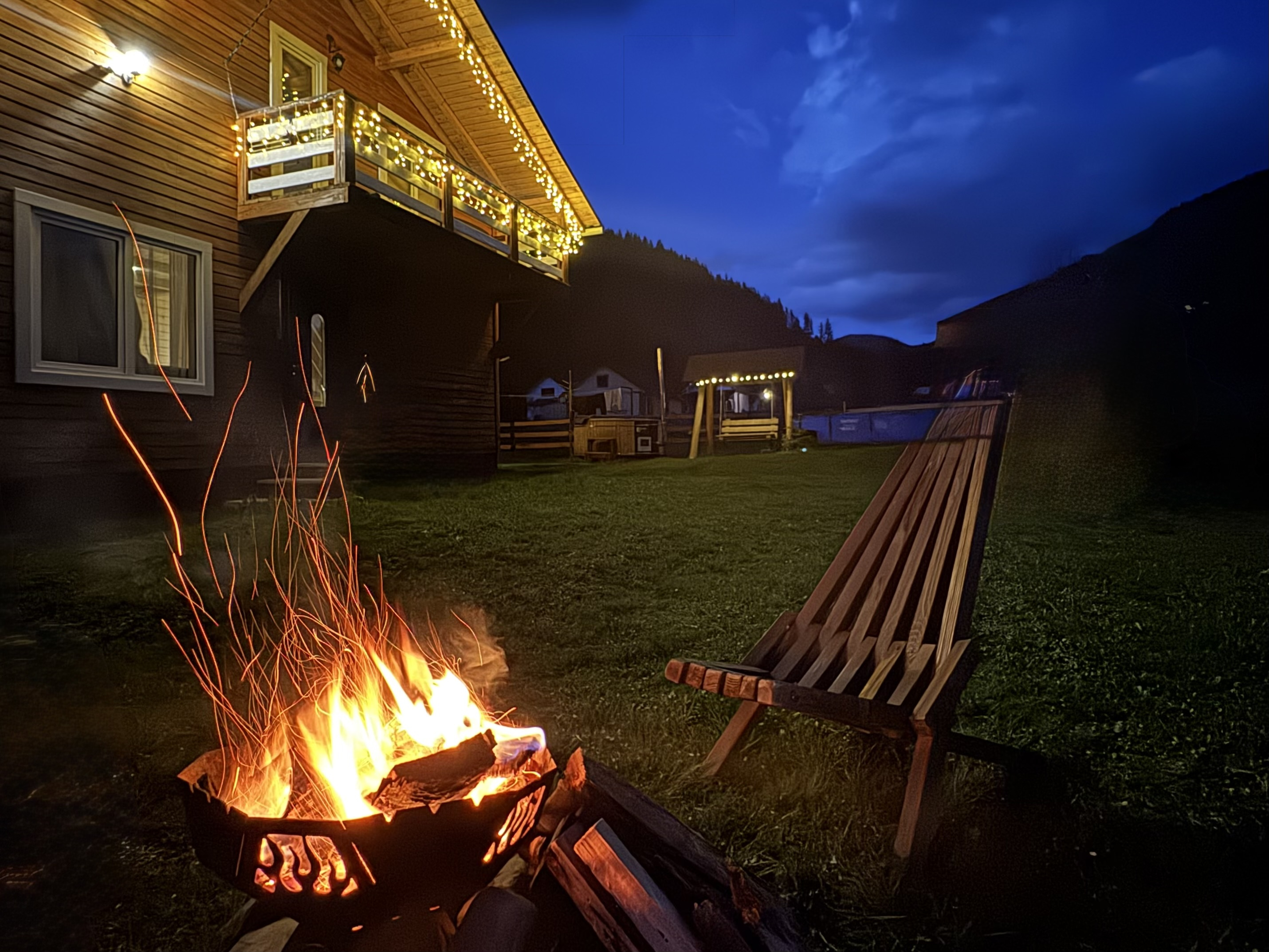 На подвірʼї декілька зони для відпочинку: чаша для багаття з місцями для відпочинку, альтанка з міні кухнею та мангалом, чан на дровах та відкритий басейн.