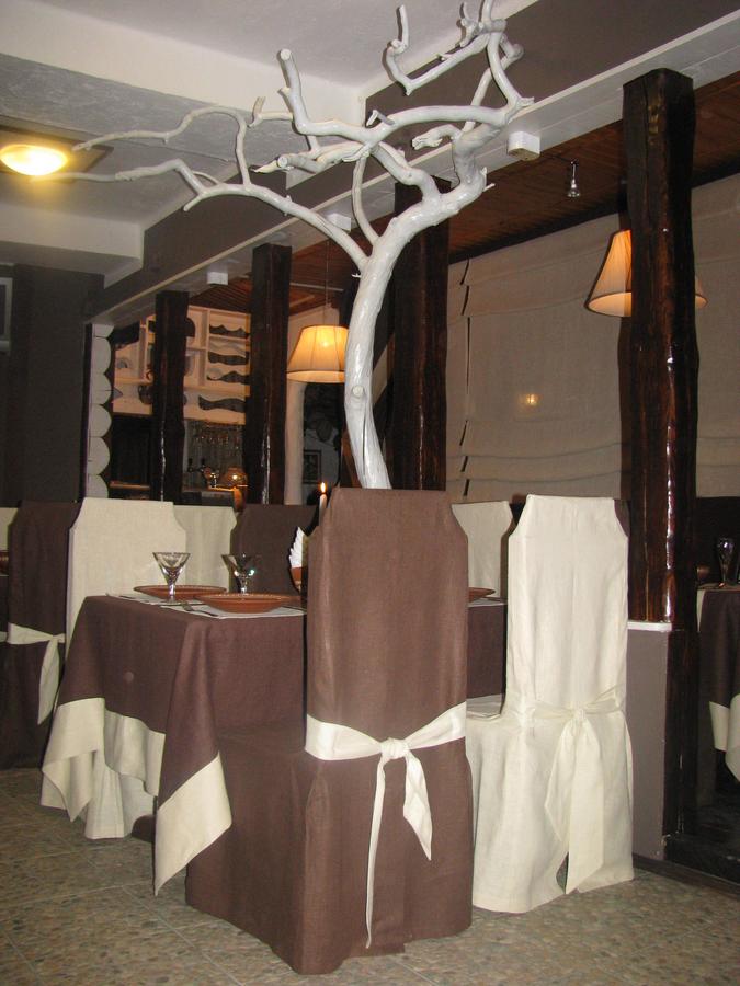 В інтер'єрі ресторану комплексу "Ґражда" домінують дерев'яні елементи декору. Тут подають страви української кухні, якими за бажання можна поласувати на літній терасі.