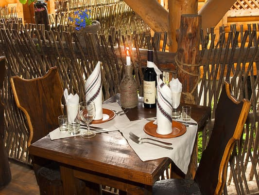 Поруч знаходиться ресторан - "Колиба". У ресторані харчування за меню. Міні-готель "На пеньках" надає гостям сніданок.