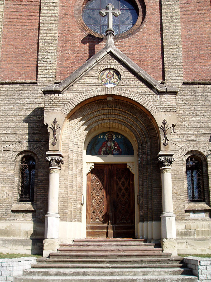 Збудована церква з цегли червоного і жовтого кольорів, із застосуванням кам'яних елементів, зовні нетинькований. Зорієнтований на осі північ-південь. З обидвох боків примикають монастирські корпуси. За плануванням це однонавова базиліка. Нава квадратна в плані, перекрита одним хрестовим склепіння. Ребра склепінь опираються на високі півколони із кубічними романськими капітелями. В бічних стінах нави влаштовано по одному вікну із півциркульним завершенням. З обох боків нави влаштовано входи до каплиць, що примикають до церкви. Перша - св. Франциска (східна сторона), друга - св. Йосафата (західна сторона). Нартекс однопрясловий, коротший від нави, піднесений відносно неї на одну сходинку. У ньому влаштовано емпору, під котрою знаходиться невеликий передсінок і два бічні проходи ведуть до східного і західного крил монастиря. З півночі від нави - презбітерій, дещо вужчий за наву, піднесений відносно неї на одну сходинку, перекритий одним пряслом хрестового склепіння. Після презбітерія - двопряслова абсида, що виходить у внутрішній двір. Фасад костелу двоярусний із трикутним фронтоном виступає назовні у вигляді ризаліту монастиря. Фронтон увінчаний кам'яним хрестом (хрест втрачено), а краї - кам'яними вежечками. Другий ярус розділений лізенами із жовтої цегли на три поля, при чому центральне поле значно ширше за бічні. На другому ярусі влаштовано кругле вікно, а над ним, у півциркульно завершеній неглибокій ніші - група з трьох вузьких вікон, з котрих середнє - вище за бічні. Портал церкви має власний трикутний фронтон, увінчаний хрестом, опертий на двох колонах з капітелями з рослинного орнаменту. В середині фронтону - півциркульна арка зі ступінчастим профілем. Над аркою в круглій ніші зображення монстранції з ангелами. Вхід звичайний прямокутний, над ним тимпан із мозаїковим зображенням Спасителя із написом ІС ХС. Дах над нартексом і презбітерієм і абсидою - двоскатний, над навою - наметовий, вкритий шифером. Дах над навою увінчаний восьмигранною, оббитою бляхою, вежечкою із витягнутим гострим завершенням із хрестом. Подібна, дещо менша вежечка увінчує дах абсиди.