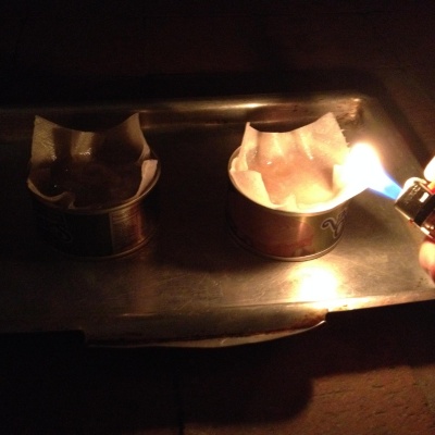 Сміло підпалюйте усі кінці замоченого жиром паперу і спостерігайте за підігрівом тунця.