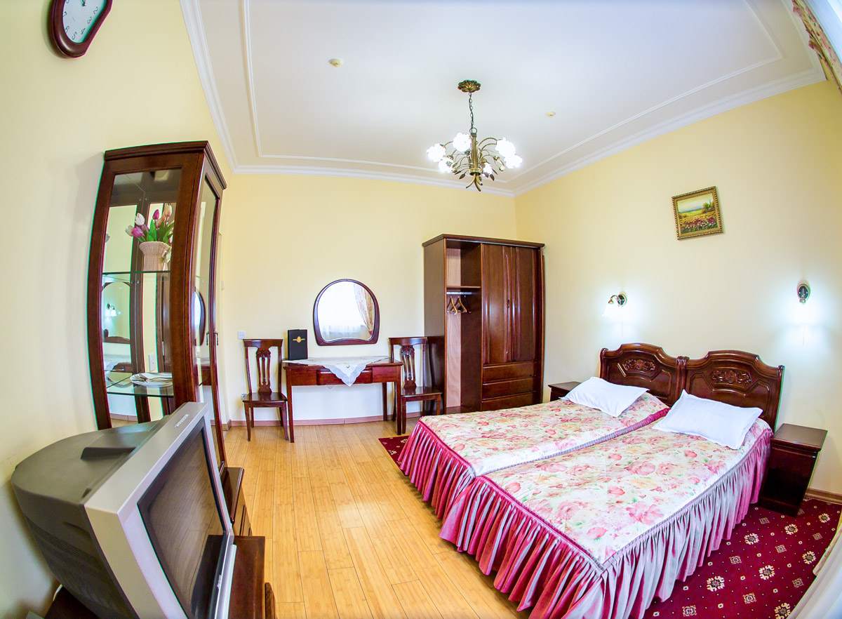 - Двомісний номер має два односпальні ліжка, телевізор, тумби, комод, стіл з кріслами, електричний чайник, шафу та санвузол (душ, туалет, умивальник).