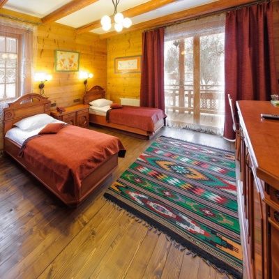 - «Напівлюкс». Також оформлені в гуцульському стилі, але інтер’єр трохи стриманіший. Ці кімнати розташовані в історичних будинках початку XX століття, відреставрованих із дотриманням традиційної архітектури. Це дозволяє відчути давню карпатську спадщину, не жертвуючи сучасним комфортом.