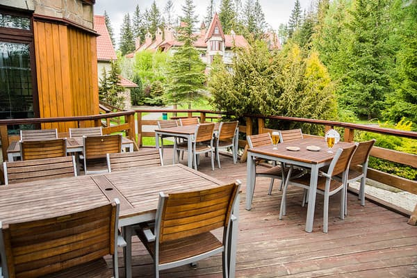 У готелі є ресторан де подають страви української та європейської кухні. Також на території готелю в літній сезон запрошуємо в бар, розташований біля відкритого басейну з підігрівом. На території готелю розташовані альтанки з вбудованими мангалами, де можна посмажити шашлик, або просто приємно провести вечір біля відкритого вогню.