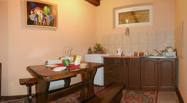 У котеджі на 8 місць та апартаментах на 5 місць є чайна кімната - холодильник, чайник, посуд, мікрохвильова піч. Мультиварку привозити не можна. На території є окрема спільна кухня. Поруч є ресторан, де гості можуть їсти.