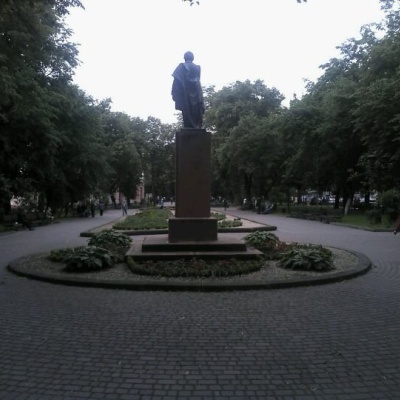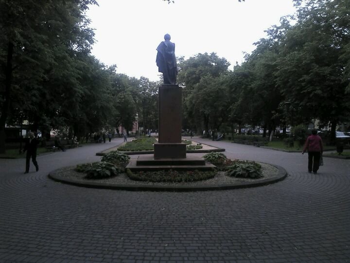 Позаду пам’ятника знаходиться обласна музична філармонія. Однак, будівля спочатку була зведена як театр музичного товариства ім. С. Монюшка. Його збудували у 1891 році на тодішній вул. Більовського (тепер - вул. Л. Курбаса). Конкурс на архітектурний проект театру виграв інженер міської залізниці Юзеф Лапіцький та отримав за це золотий перстень. На той час будівля філармонії виглядала зовсім інакше, ніж зараз. Це можна побачити на старих листівках Станіславова. 1939 році будівля належала музично-драматичному театру ім. І. Франка, який у 1980 році одержав нове приміщення на вул. Незалежності.