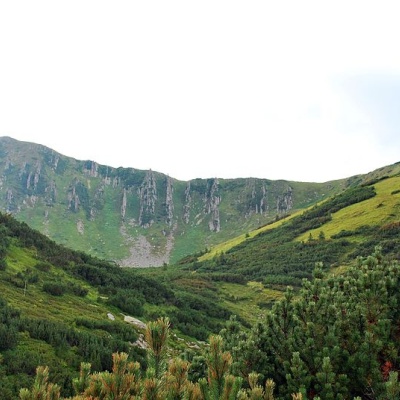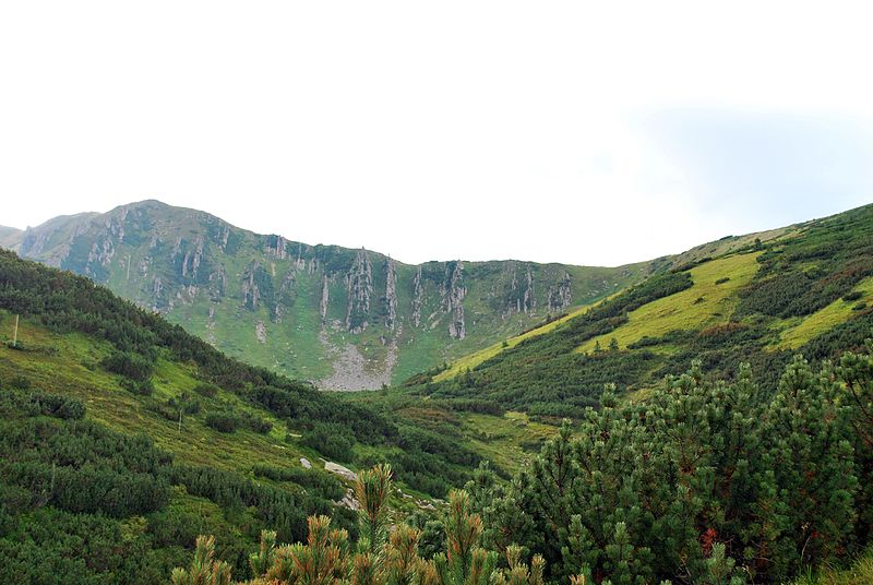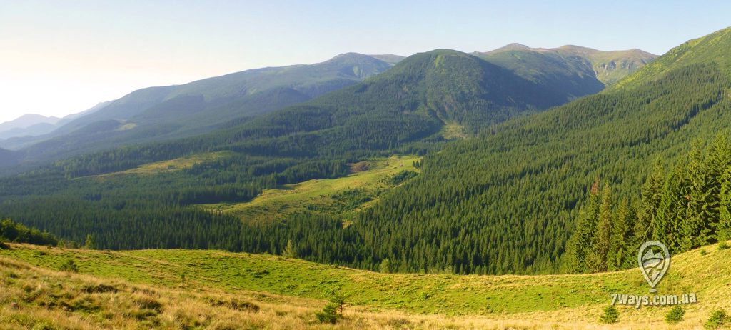Ліс переходить в альпійські сосни, потік стрімкішає, здалека видно каскади водоспадів. Виходимо на полонину, розмір кулуару між Шпицями, Ребрами і Кедроватим вражає величчю - це все Гаджина.