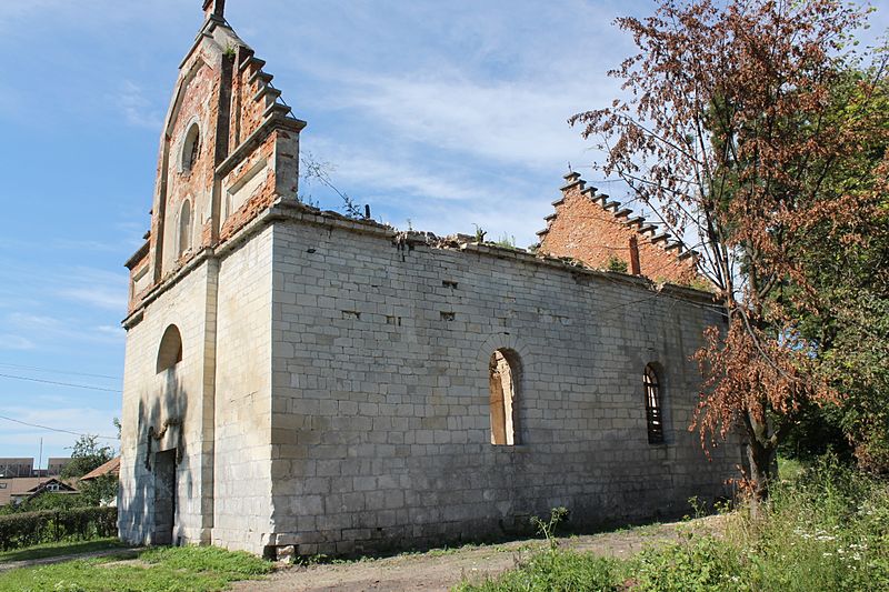Храм побудований із тесаного каменю вапняку, з цегляними фронтонами. Прямокутна нава (неф) з верхнім і нижнім святилищем (пресбітерієм), що замкнута півколом апсиди. Фасад трьохярусний з круглим вікном (роза) з мереживним орнаментованим оздобленням, збагаченим насиченими кольоровими вітражами. При святилищі з південного боку знаходиться ризниця (захристя). Стіни храму із зовнішньої сторони — гладкі, непотиньковані, не мають архітектурного декору, лише на головному фасаді є ризаліт, котрий слабо виступає та довершений цегляним ступінчастим фронтоном. Двосхилий дах, а на гребені даху була встановлена ажурна сигнатурка з хрестом, яка разом з дахом завалилася і цілковито зруйнувалася в 2013 році. Хрест нині зберігається у місцевому храмі Покрову Пресвятої Богородиці. У верхній частині фронтону ніша, де до 2015 року знаходилася гіпсова (алебастрова) фігура Непорочного Зачаття Пресвятої Діви Марії. Фігура виконана у 1893 році відомим польським скульптором італійського походження Віктором Дзаккі.