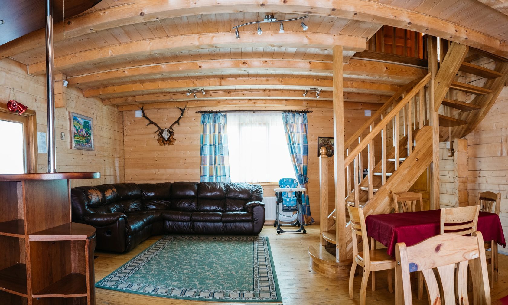 • Заходячи всередину ви попадаєте в передпокій, який переходить в головну кімнату де знаходиться великий деревяний стіл з деревяними лавами, щоб якнайбільше передати дух сколівщини та мякий куток, який при потребі розкладається і перетворюється в спальні місця. Меблі для розміщення вашого одягу та кухня в правому куті з інвентарем, щоб будучи далеко від дому ви і надалі могли готувати ваші улюблені страви ( а саме: баняки, тарілки, столові прибори і впринципі все, що знайдете). Окрема ванна кімната вміщає в собі : ванну, умивальник з дзеркалом, туалет і звісно фен.
