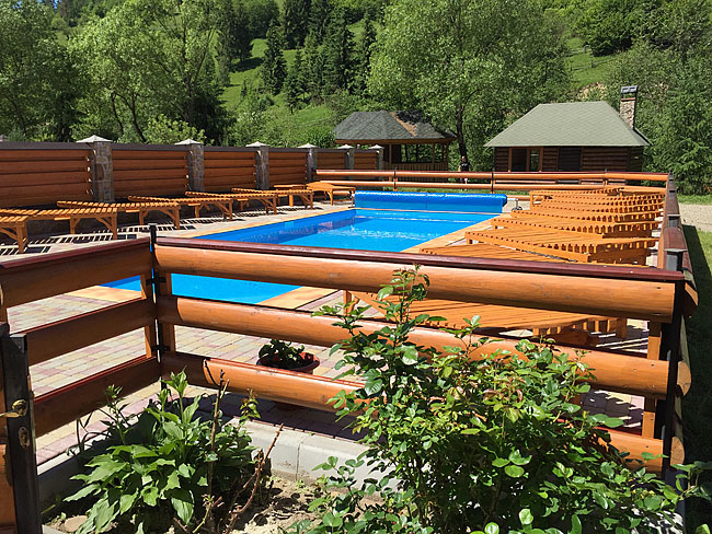 Харчування дво- або триразове у колибі за меню. Домашня кухня. Є можливість користуватися кухнею (плита, мікрохвильова піч, холодильник, електрочайник, посуд). До найближчого магазину - 20 м, кафе - 300 м. Прокат велосипедів, настільний теніс, бадмінтон, м'ячі. Відкритий плавальний басейн з підігрівом (4x10 м), шезлонги. Прокат лижного спорядження, в т. ч. дитячого та одягу, послуги інструктора.
