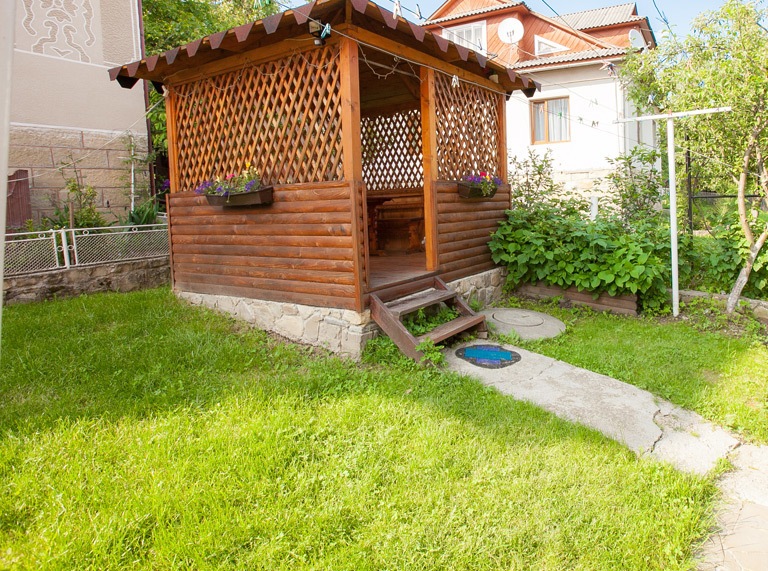 Садиба складається з окремого дерев'яного будинку на 4 номери та номерів у будинку з господарями. Спокійний сімейний відпочинок.