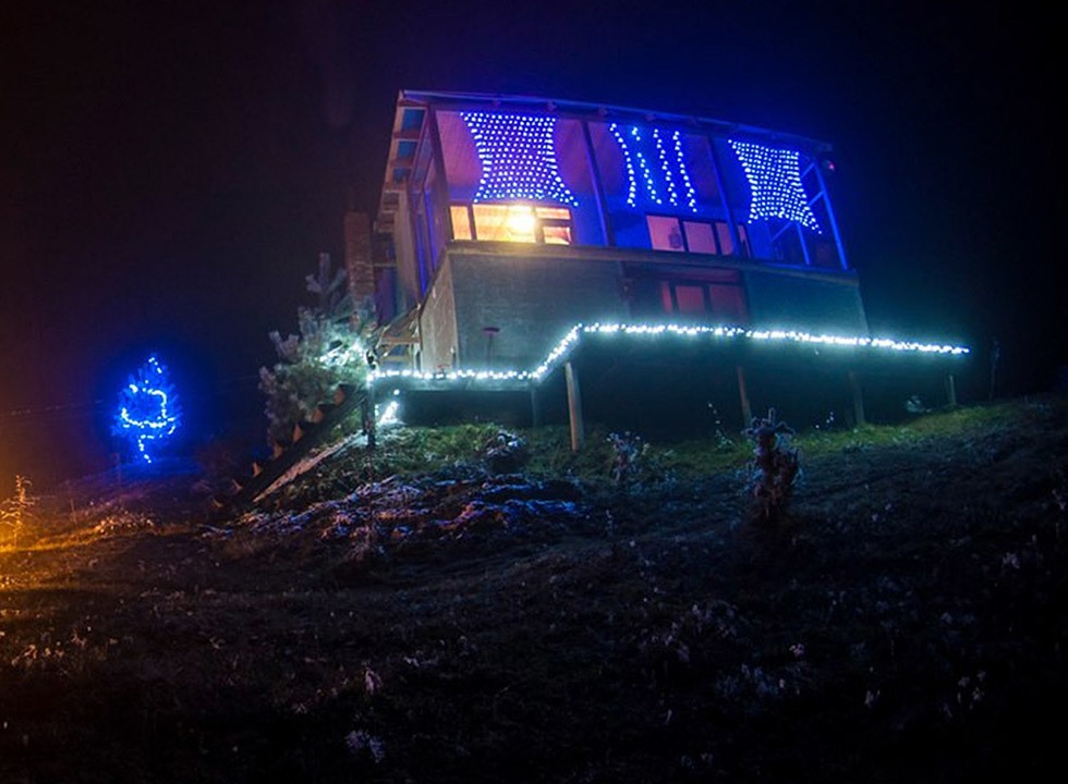 В лісі господарі створили затишний дерев'яний котедж на дереві з верандою на 4 спальних місця і каміном (дивіться фото).