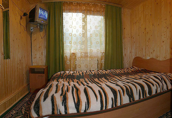 - На першому поверсі — облаштована для самостійного приготування кухня (газова плита, набір посуду, мікрохвильова піч, холодильник, електрочайник, обідній стіл), дві кімнати (в одній кімнаті є двоспальне ліжко, розкладне крісло, шафа для одягу, в іншій — розкладний куток, телевізор), спальня (2 розкладні дивани, шафа для одягу, телевізор), роздільний санвузол (ванна, душова кабіна, умивальник; туалет);