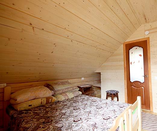 - Двоповерховий котедж на 4 місця. На першому поверсі - сауна. На другому поверсі (окремий вхід знадвору) - 2 двомісні кімнати (у кожній - двоспальне ліжко, полиці для одягу; санвузол - душ, туалет, умивальник).