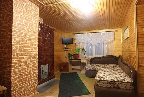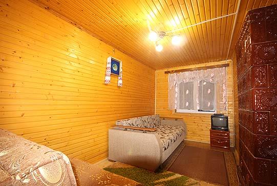 - На першому поверсі - кухня (кухонне вогнище, газова плита, мікрохвильова піч, холодильник, електрочайник, посуд, мийка, обідній стіл), 2 суміжні кімнати (в одній є двоспальне ліжко, шафа для одягу; в іншій - розкладні диван та крісло, шафа для одягу, телевізор), санвузол (душова кабіна, туалет, умивальник). На другому поверсі - 2 тримісні кімнати (у кожній — 2 розкладні дивани, шафа або вішалка для одягу, телевізор);