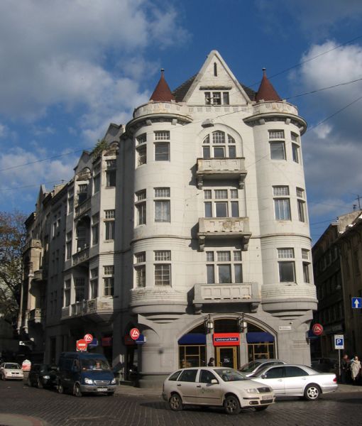 Будинок знаходиться на краю кварталу, на торцевій парцелі, яка має форму трапеції. Наріжна ділянка охоплена вулицями Фредра, Ґерцена та просп. Шевченка. Виразний силует будівлі акцентує південну межу проспекту. Будинок чотириповерховий, мурований з цегли, у конструкції застосовано залізобетон. Має три фасади з еркерами та піввежами на кутах, накритий високим дахом. Корпус в плані V-подібної конфігурації. Внутрішнє планування – коридорно-анфіладного типу, з двома помешканнями на кожному поверсі. Вхід до будинку – через вузький тамбур з кесонованою стелею. У масивних архітектурних формах проектант використав модернізовані мотиви готики.